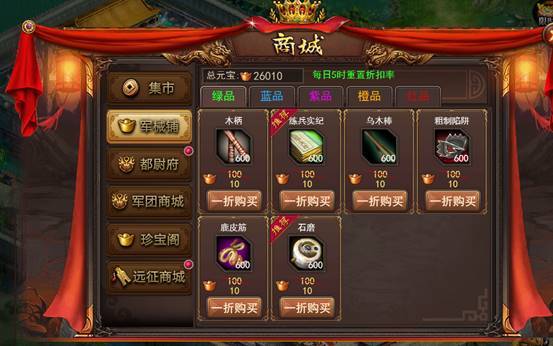 15级开放军械铺,军械铺中出售所有武将训练材料。军械铺默认开放绿色材料售卖,当玩家等级到达30、50、75级时,会分别开放蓝色、紫色、橙色材料售卖。军械铺中每日会重置商品折扣。