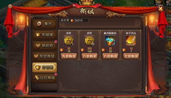35级开放珍宝阁,珍宝阁中出售虎符以及陨铁包,孙子兵法等