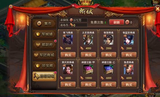 15级开放集市商城,集市中会出售武将经验书、陨铁、训练材料、神器宝箱、宝物碎片、粮草等常规资源,消耗元宝或铜钱可进行购买。点击集市中的刷新按钮,可刷新当前商品。系统每日将赠送5次免费刷新的次数,免费次数耗尽后再次进行刷新需消耗铜钱。