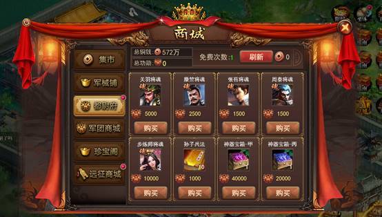 35级开放远征商城,远征商城中会出售武将碎片及宝物碎片,消耗布币可进行购买。点击商城中的刷新按钮,可刷新当前商品。系统每日将赠送1次免费刷新的次数,免费次数耗尽后再次进行刷新需消耗铜钱。