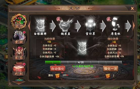 点击界面下方的强化按钮,可进行宝物强化。强化宝物需消耗铜雀令,每成功强化一次均会提升强化进度。强化进度每达成一个刻度,即可获得属性提升。